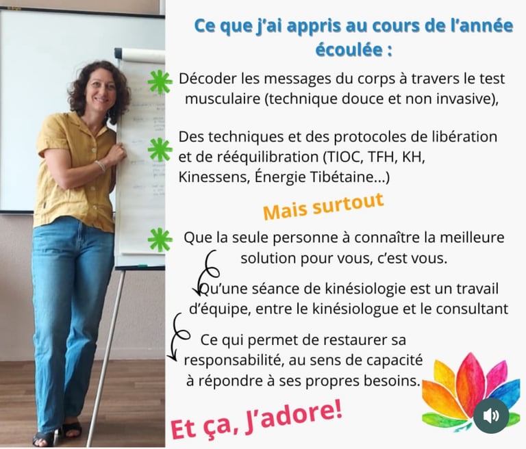 "Envie de retrouver énergie, confiance et sérénité? Je vous accompagne grâce à la kinésiologie, une méthode douce qui aide à libérer les blocages émotionnels, réduire le stress, améliorer votre vitalité et vos capacités d'adaptation. Chaque séance est adaptée à vos besoins, dans un espace bienveillant, sécurisant et sans jugement, pour avancer à votre rythme et reconnecter à vos propres ressources."